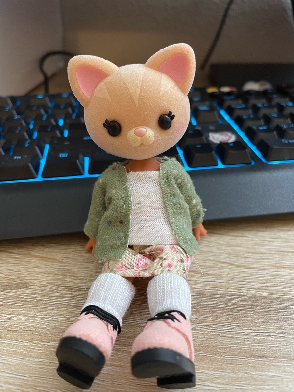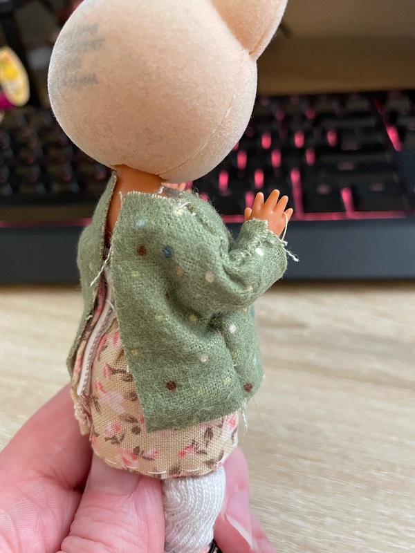 A couple weeks ago, I beheaded one of those Cutie Loo figures to transplant onto a Penny's Box string-jointed doll body. This is my first hybrid doll and I'm really enjoying working on it! I'm dressing her up in a mori kei inspired style.