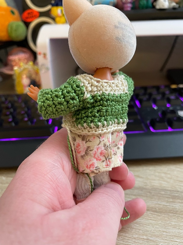 Well... It's just not working out the way I hoped. I tried so many times, but it's just too dang bulky on such a tiny doll. Instead, I think I'll crochet a scarf for her. I won't have to worry about things like seams, and I think a bulky scarf could be cute!